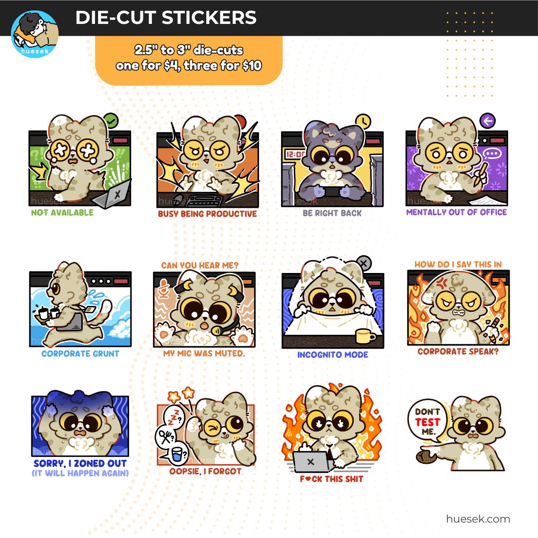 Note: If you choose "Pick X", name the versions you want and how many of each in the "Notes to Seller" section, ie. "Corporate Cat Stickers - One Corporate Grunt, Two Oopsie"